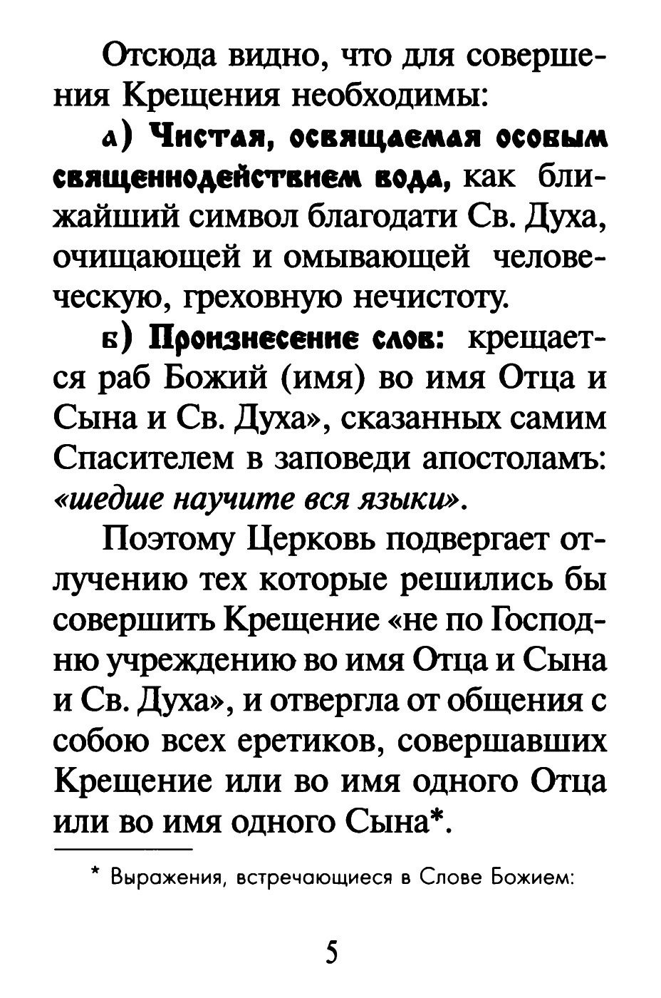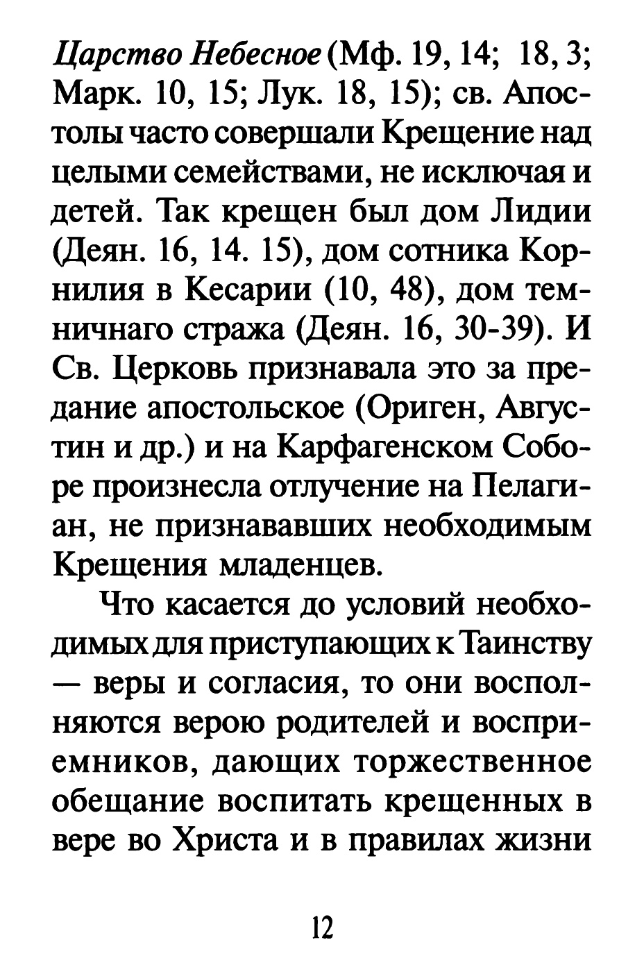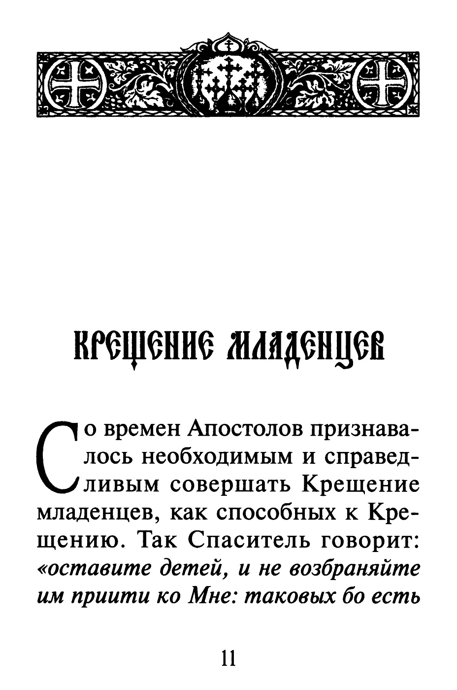 «шедше, научите вся языки, крестяще их во имя Отца и Сына и Святого Духа» (Мф. 28, 19), что апостолы и исполняли, принимая в общество верующих не иначе, как чрез Крещение (Дея. 2, 38-41; 8, 12; 10, 48); так смотрела и поступала Церковь и после.