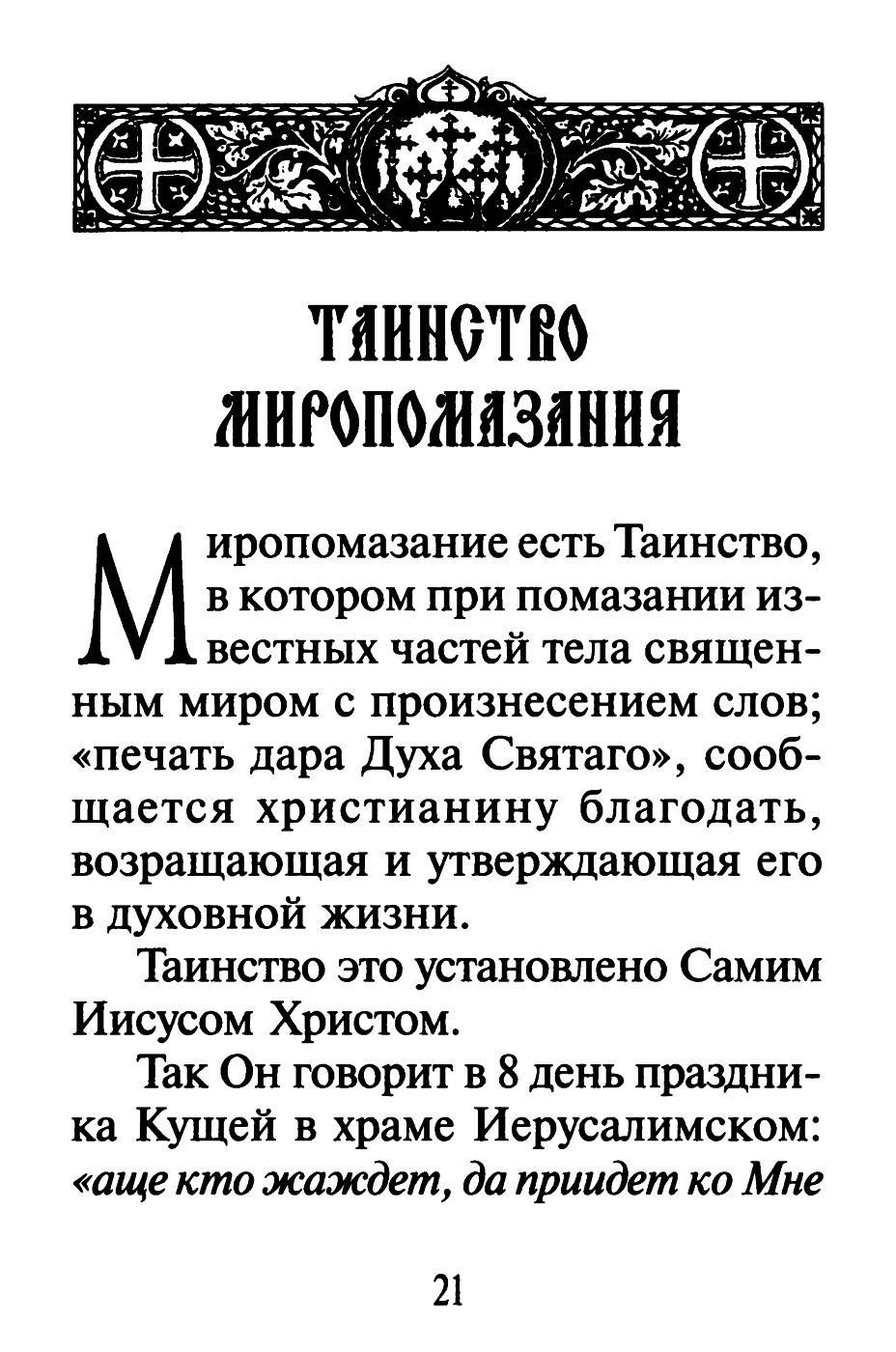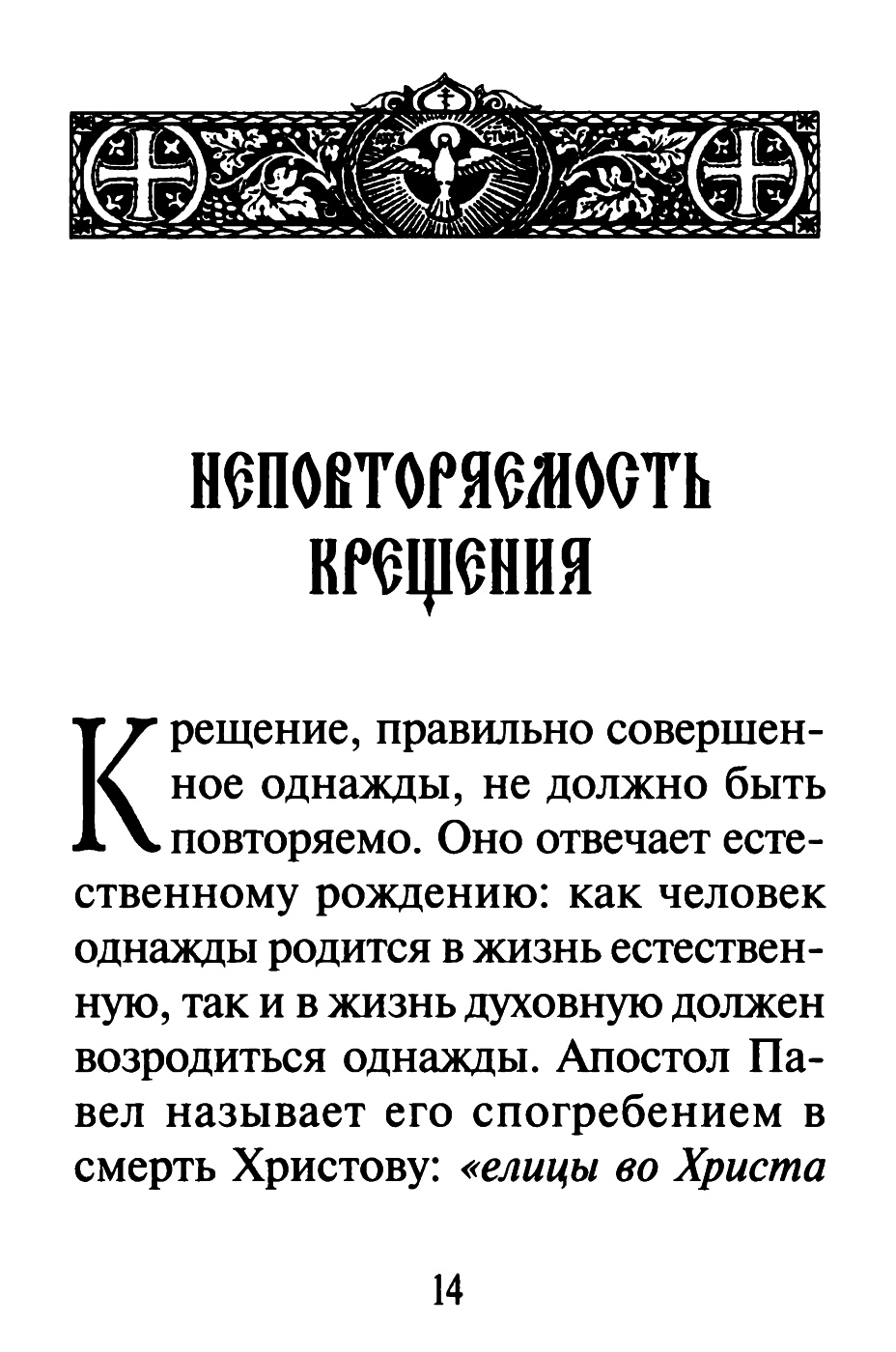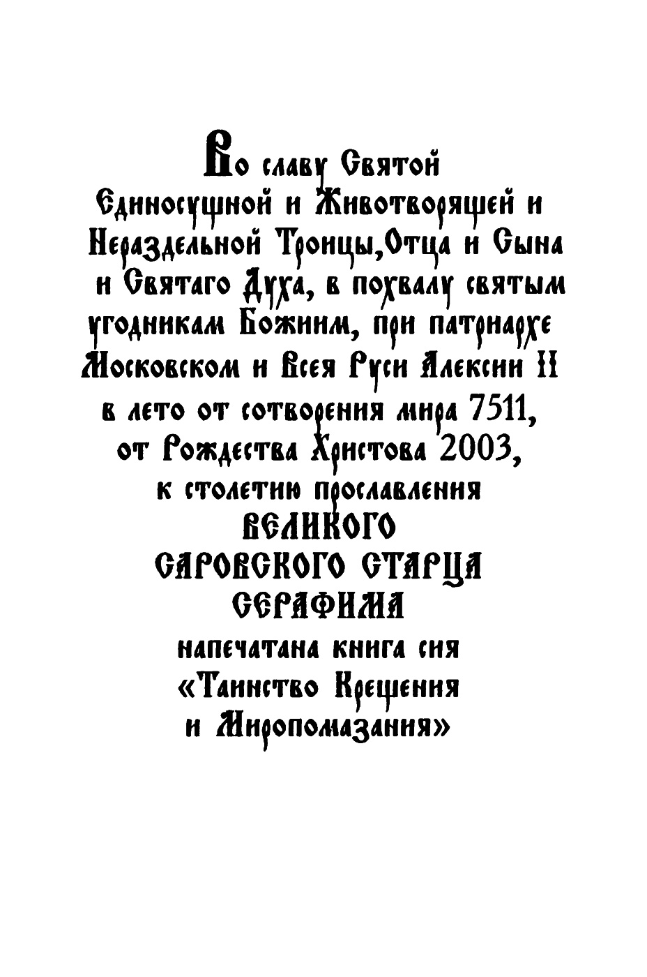 Во славу Святой Единосущной и Животворящей и Нераздельной Троицы, Отца и Сына и Святаго Духа, в похвалу святым угодникам Божиим, при патриархе Московском и Всея Руси Алексии II в лето от сотворения мира 7511, от Рождества Христова 2003, к столетию прославления ВЕЛИКОГО САРОВСКОГО СТАРЦА СЕРАФИМА напечатана книга сия «Таинство Крещения и Миропомазания» Оглавление